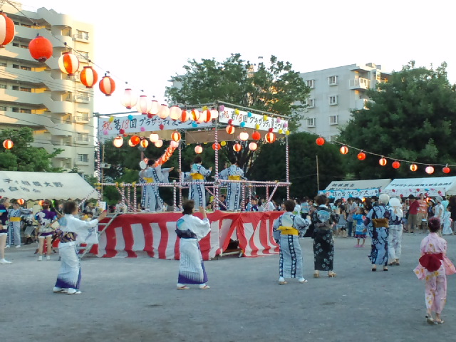 Although it is hot and humid, I like this season because lots of festivals are held. The most popular one everywhere in Japan is the one like the photo below, Bon Odori (a kind of folk dance, we don't add `festival' at the end).